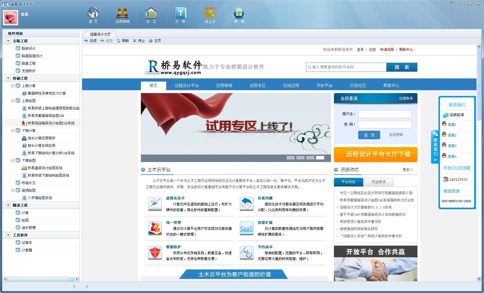 第二步:通过注册帐号和密码登录远程设计大厅,直接选择您需要使用的DS软件(这里以桥易盖梁设计绘图系统为例,前提是您的电脑已安装支持软件的Auto CAD版本);